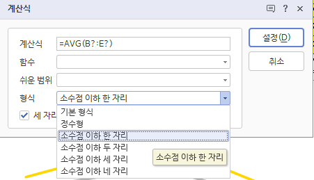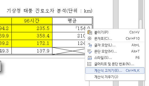 평균이 계산된 첫 번째 칸에 클릭후 마우스 우측 > 계산식 고치기로 들어갑니다.