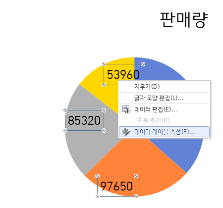레이블(숫자)에서 마우스 우측 > 데이터 레이블 속성